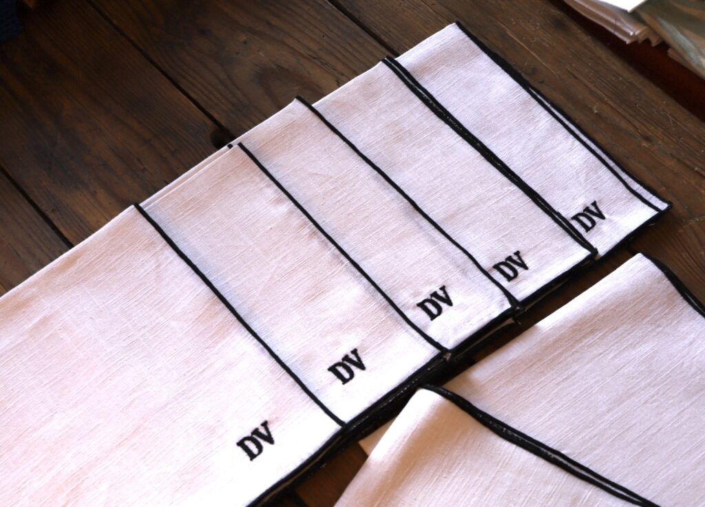 Set de 10 servilletas de lino blanco con festón negro con bordado en letra normal y negro «DV». Presentamos nuestra exclusiva colección de servilletas con bordados DV, una elegante adición a tu mesa que combina sofisticación y estilo. Cada una de estas cinco servilletas está meticulosamente confeccionada en lino blanco de la más alta calidad, ofreciendo una sensación de lujo y refinamiento a cada comida. El detalle de curvy negro en el borde añade un toque de modernidad y contraste, elevando el diseño clásico a un nivel completamente nuevo. El bordado DV, en letra normal, en la esquina de cada servilleta, agrega un toque personalizado y distintivo que seguramente impresionará a tus invitados. Ya sea para una cena íntima o una ocasión especial, estas servilletas son el complemento perfecto para cualquier mesa elegante. Disfruta de la belleza y la calidad excepcionales de nuestras servilletas con bordados DV y haz de cada comida una experiencia memorable.