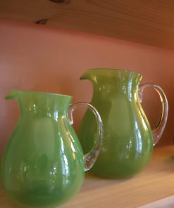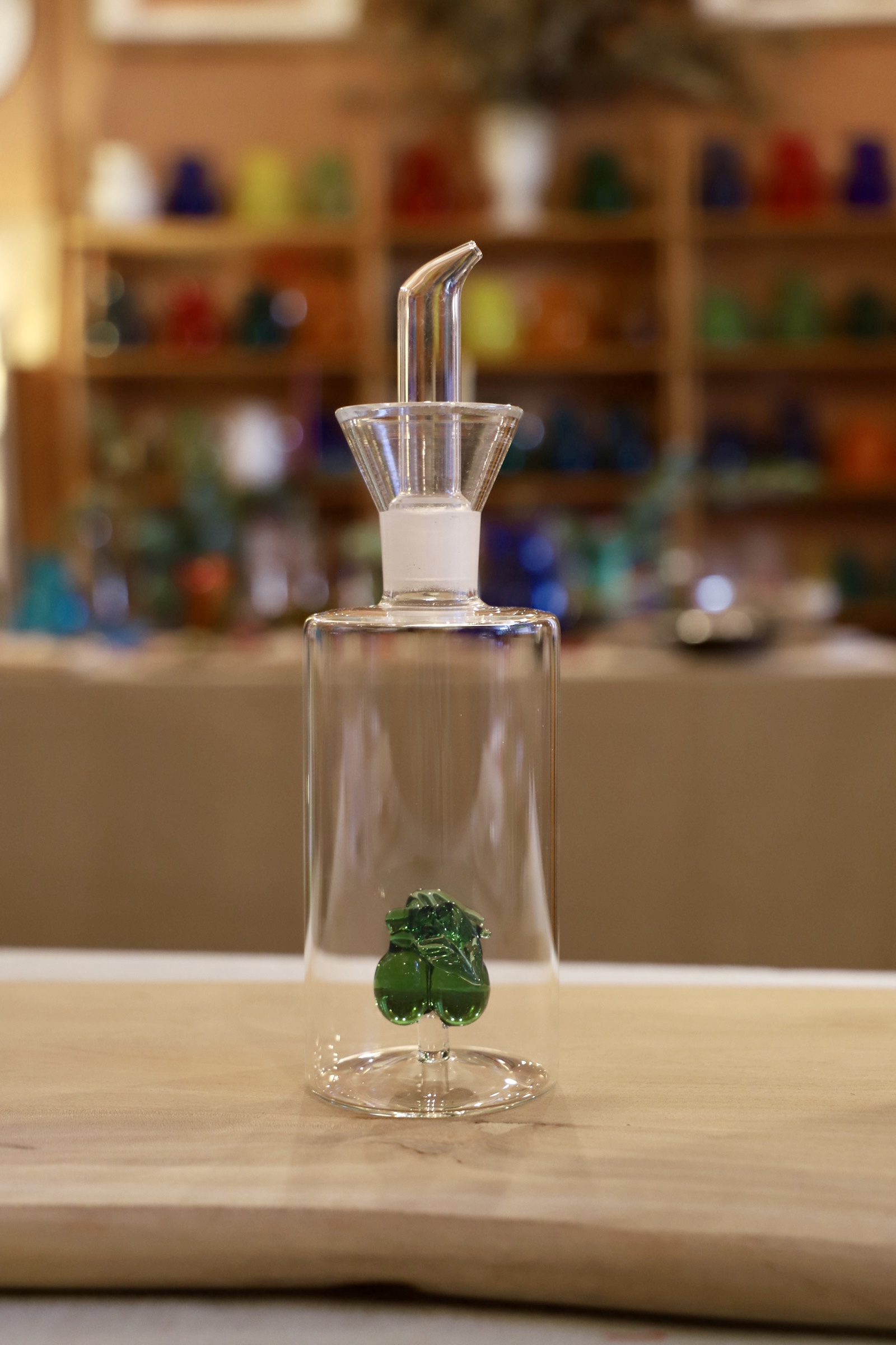 Aceitera de vidrio/ cristal con unas olivas en color verde que quedan dentro de la aceitera para indicarnos, con este diseño tan exclusivo, que dentro hay aceite de oliva.