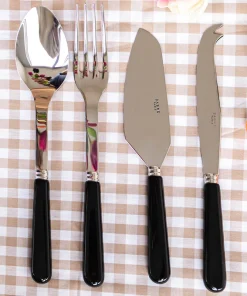 El resultado es una colección de cubiertos que destaca por su diseño sencillo y elegante, con detalles cuidadosamente pensados para evocar el estilo auténtico de los tradicionales bistrós franceses. Los remaches visibles en los mangos aportan un aire clásico y artesanal, mientras que la amplia variedad de colores y materiales permite adaptarlos a cualquier mesa y ocasión. Desde los vibrantes tonos rojos y azules hasta las sofisticadas texturas con efecto de cuerno o carey, cada pieza ha sido concebida para combinar funcionalidad y estética con un refinamiento excepcional. Además, para satisfacer diferentes preferencias, esta colección está disponible en dos acabados: un brillante y moderno, que aporta luminosidad a la mesa, y otro con un delicado efecto vintage, ideal para quienes buscan un aire nostálgico y atemporal. Estamos convencidos de que esta colección logrará conquistarle, ya que logra un equilibrio perfecto entre la tradición y la modernidad.