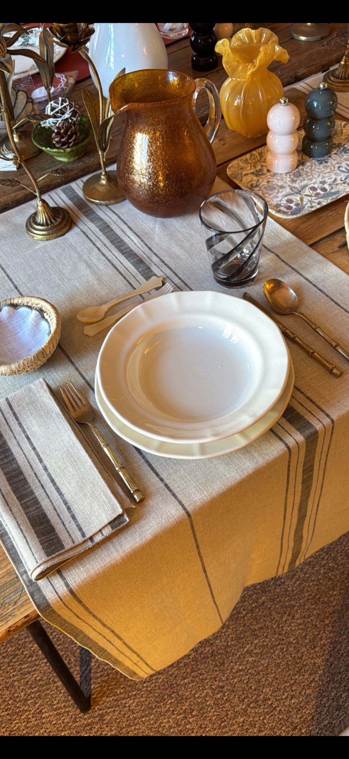Camino de mesa en tejido Lino rústico, un color de fondo en tostado con rayas anchas y estrechas en color gris oscuro. ¡Un tejido fácil de combinar con vajillas y cristalerías! Estos diseños no solo reflejan el amor por lo artesanal, sino que también evocan la calidez de las cocinas tradicionales y los mercados llenos de ingredientes vibrantes y frescos.