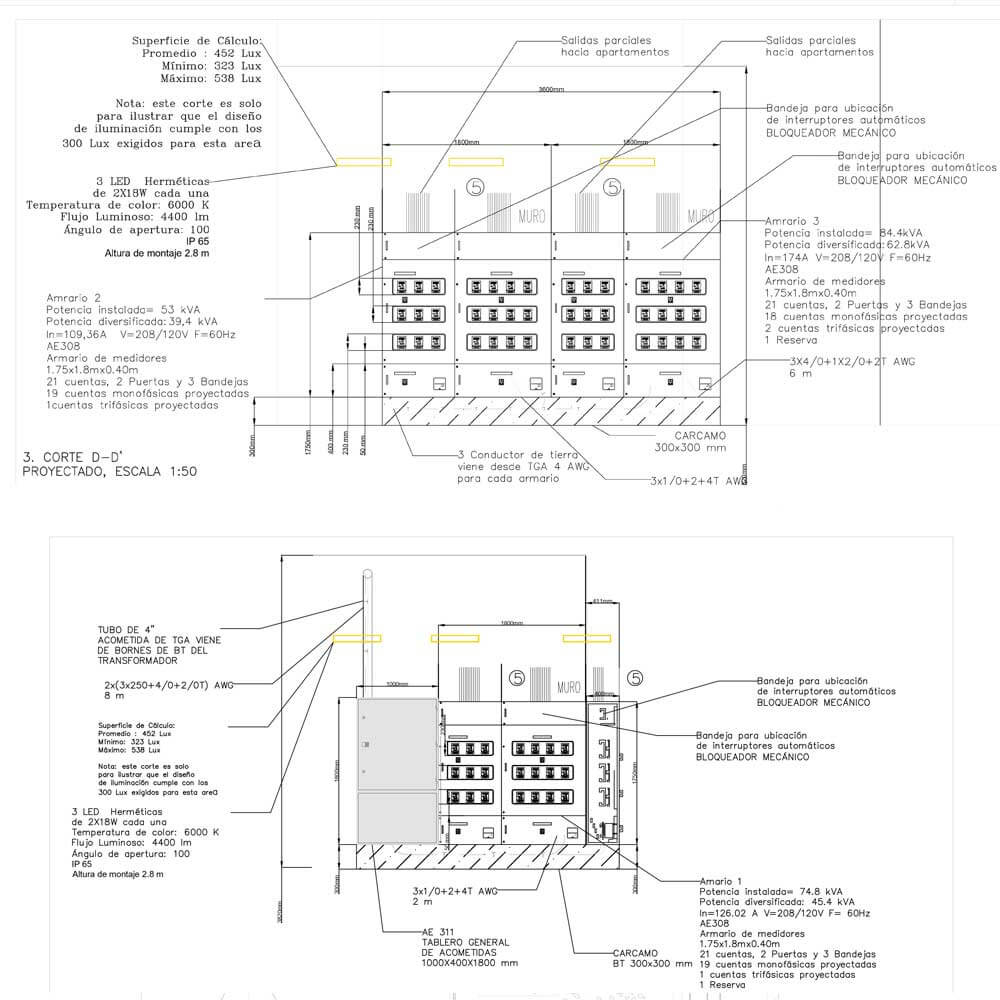 Cortes (Horizontales y Verticales): Proveen detalles sobre distancias de seguridad, dimensiones de equipos, rutas de conductores y otros aspectos relevantes para la correcta interpretación del diseño.