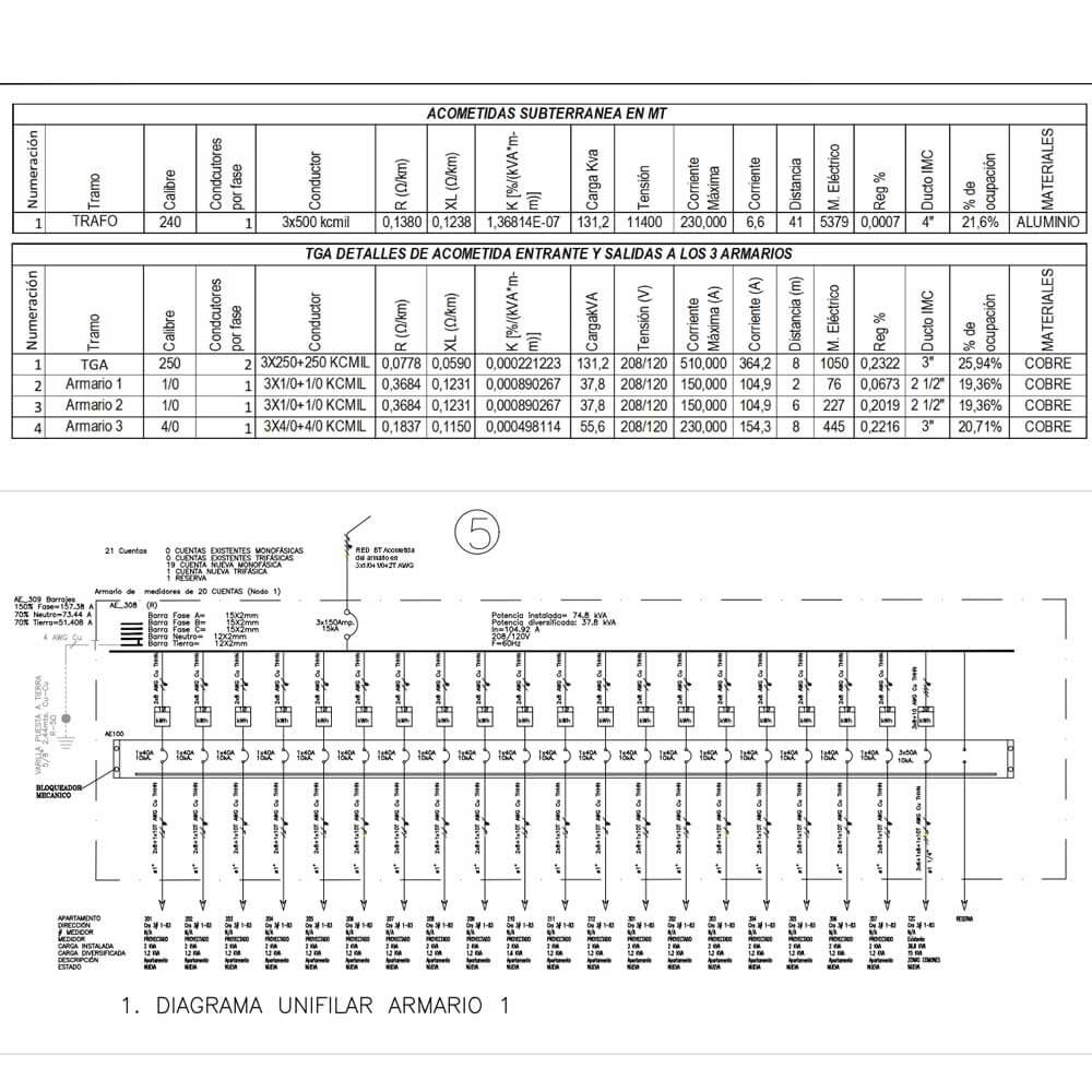 Diagramas Unifilares (Existente y Proyectado): Representaciones esquemáticas que ilustran la interconexión de las redes actuales y las propuestas, incluyendo puntos de conexión, características de los conductores, protecciones y equipotencialización de equipos.