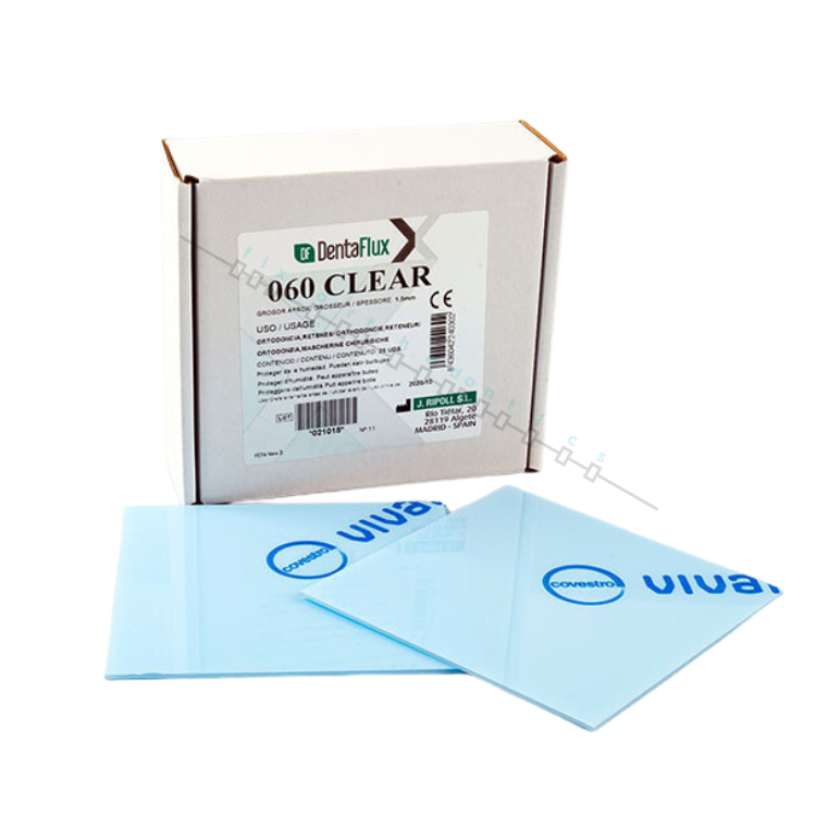 Planchas termoplasticas marca Dentaflux.Están hechas de poliéster de ácido tereftálico. No contienen látex.