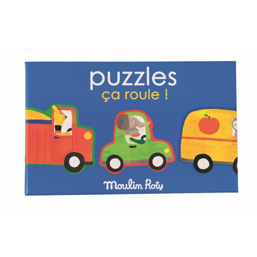 Puzzle de vehículos de la marca Moulin Roty disponible en tienda. Esta caja contiene 4 puzzles de 6 a 11 piezas cada uno. Tu peque debe juntar los 3 coloridos coches conducidos por los personajes Popipop con la carretera por la que circulan en su lugar correspondiente. Este juego de primera infancia es ideal para desarrolar la observación y la motricidad fina