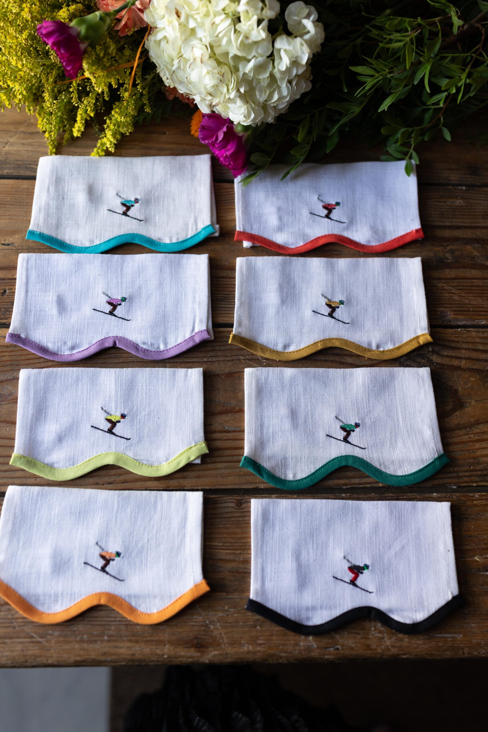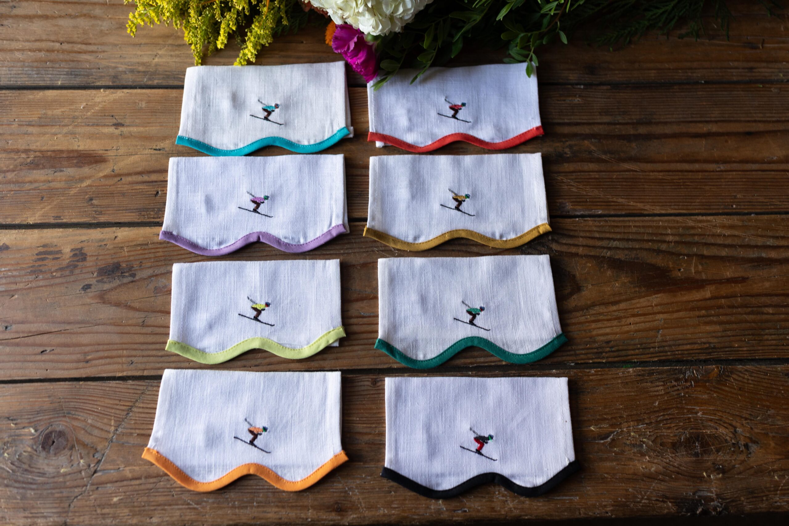 Pack de 8 servilletas de aperitivo blancas de lino con festón burdeos y 8 dibujos bordados del deporte ski.