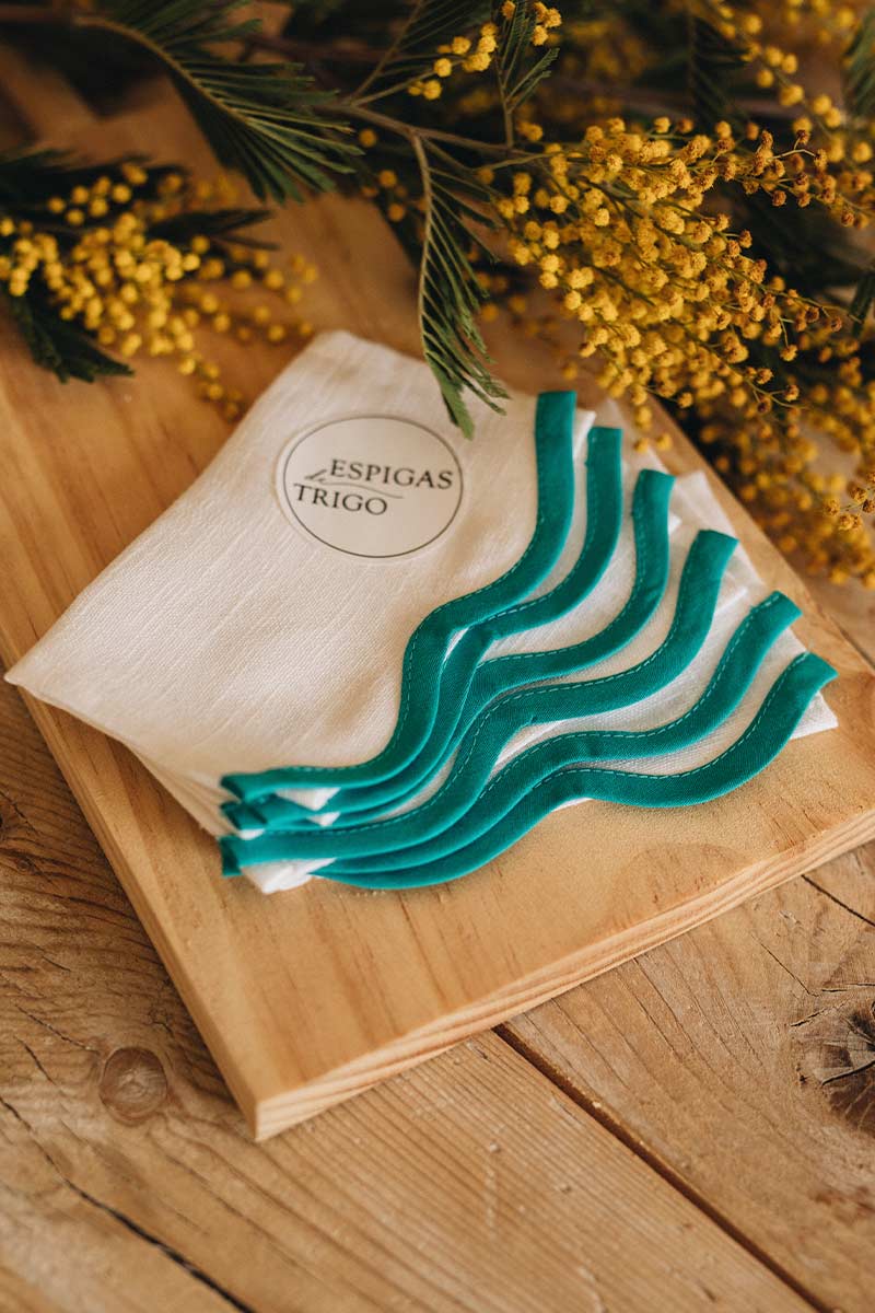 El Pack de 6 servilletas de lino blanco con curvy turquesa son la opción perfecta para el aperitivo. Confeccionadas en lino blanco de alta calidad, estas servilletas ofrecen una textura suave y duradera, ideal para cualquier ocasión especial. El curvy turquesa en los bordes aporta un detalle moderno y delicado, creando un contraste suave pero llamativo que resalta el diseño.