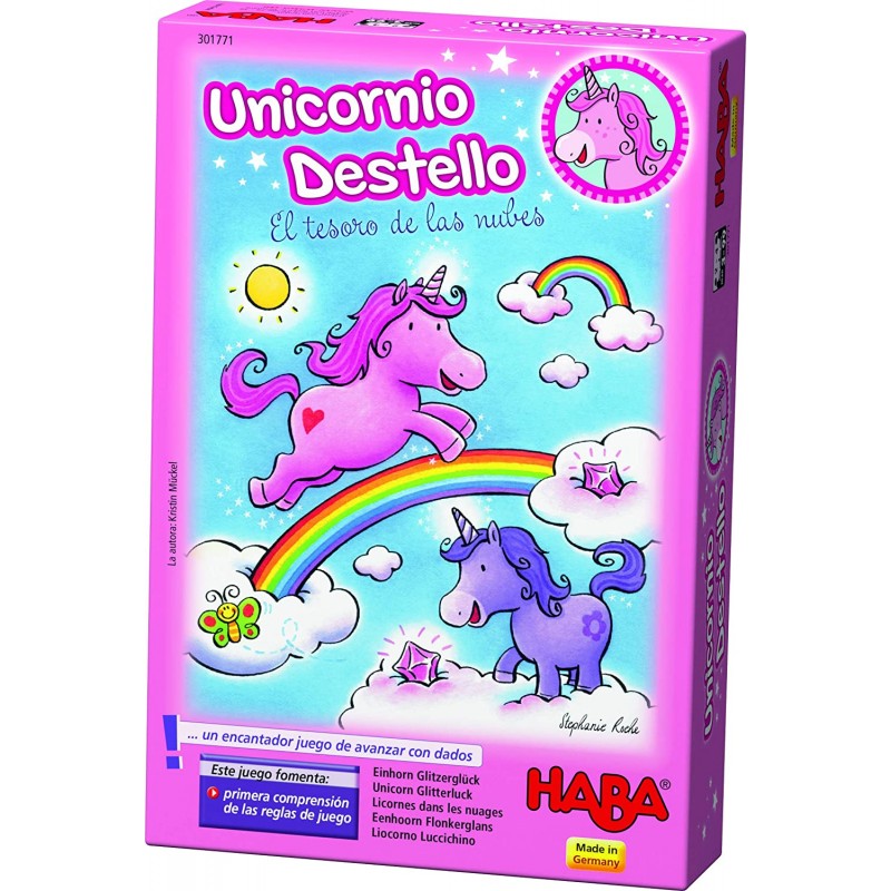 Unicornio Destello es un juego de Haba que trata sobre 4 unicornios que viven en el lejano País de las Nubes. Van a galope alegremente por las nubecitas de algodón, se deslizan por el tobogán del arco iris o juegan con los cristales de las nubes. ¡De pronto se levanta una tormenta! ¿Quién ayudará a los unicornios a llegar rápidamente hasta el sol y a reunir por el camino el mayor número de cristales de nubes para ponerlos a salvo? Gana quien recupere el mayor número de cristales